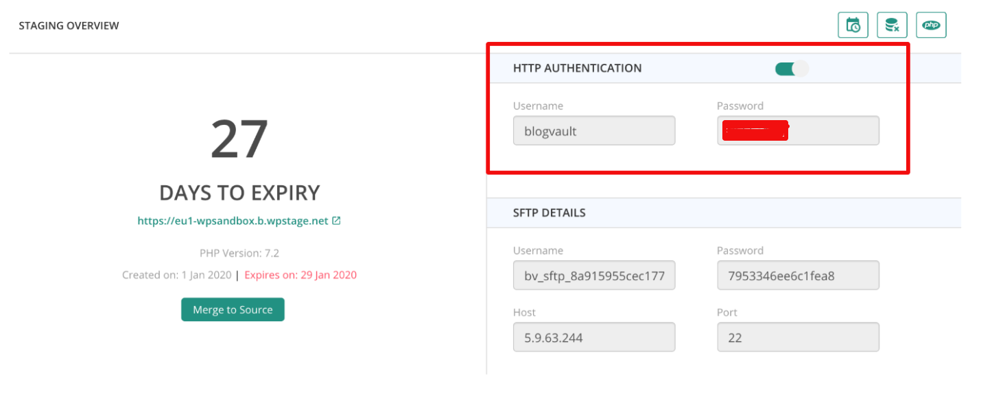 Note: When you want to share the staging site with other users, HTTP Authentication User and Password credentials are required. These are mentioned in the Staging section of the dashboard.