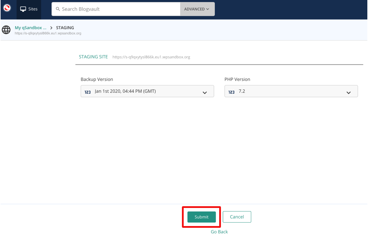 Step 4: Next select the Backup version and the PHP version you want to stage from the respective drop-down menu. Click Submit.