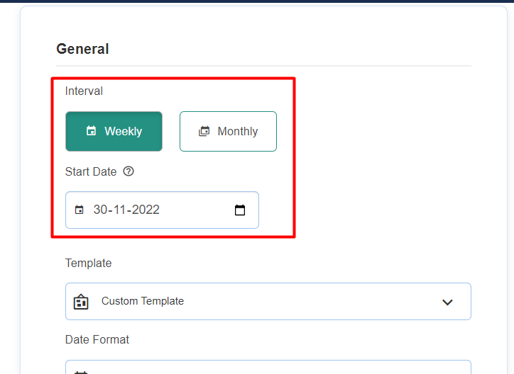 Step 4: Select the Interval for which you want to schedule the report at the top of the page. After that, you can select the date from when you want to start the reporting cycle.